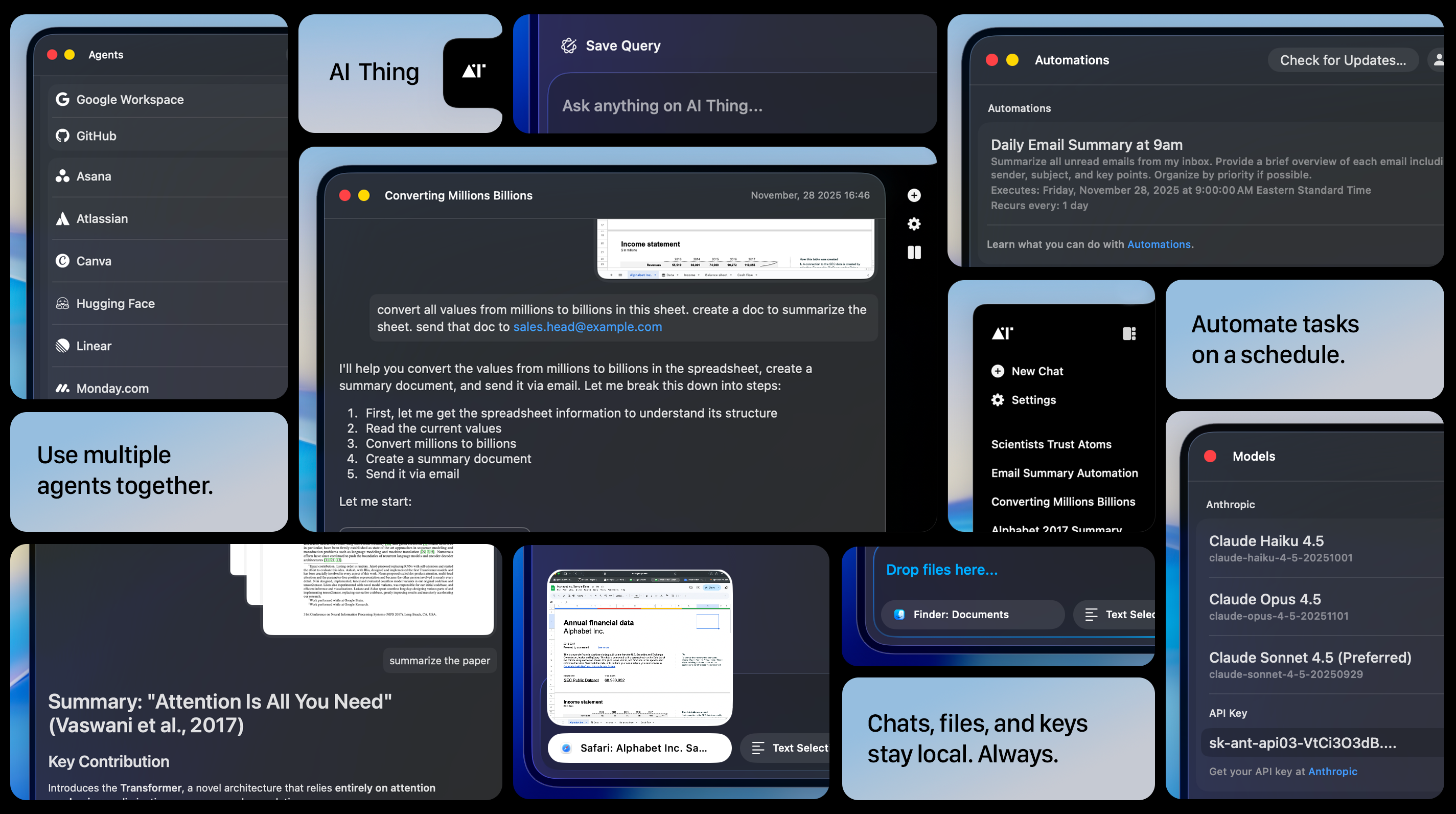 AI Thing is a privacy-first personal AI automation tool that runs entirely on your terms. Use your own API keys, connect powerful agents like Google, GitHub, and Notion, and work with unlimited local files — all while keeping data stored only on your device. Granular permissions ensure the AI gets just enough access to help, nothing more.Have questions? Email us at [email protected].